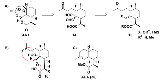 ESTRATÉGIAS SINTÉTICAS Logo após a elucidação estrutural da ART em 1977, químicos rapidamente responderam ao desafio de sintetizar em laboratório essa molécula de elevada complexidade estrutural: sete centros estereogênicos, contendo um endoperóxido. A análise retrossintética no Esquema 1A mostra desconexões para a construção do sistema bicíclico oxigenado através de intermediários chaves: a ART pode ser visualizada como um acetal-cetal-lactona, que após a abertura dos anéis revelando as carbonilas (14), poderia ser obtida a partir do ataque do hidroperóxido através do intermediário chave 15. Assim, foi possível explorar as reações em cascata catalisada por ácido (16, Esquema 1B) utilizadas na maioria das rotas sintéticas de obtenção da artemisinina.26