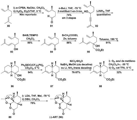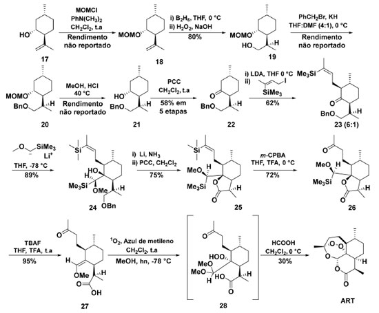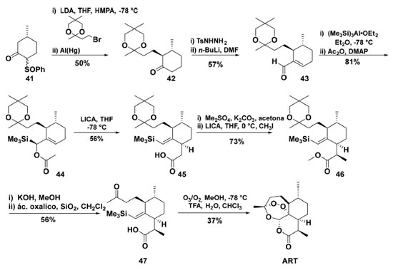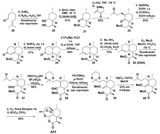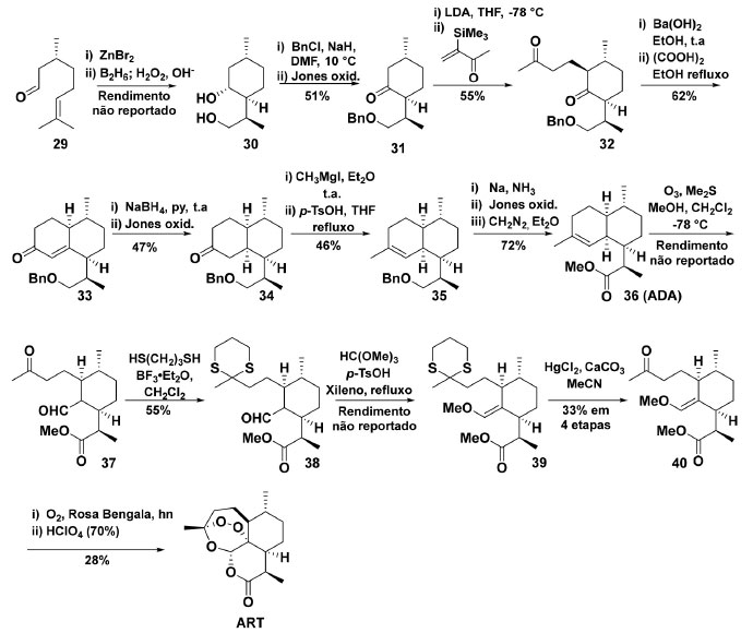 Primeiramente, o citronelal (29) foi ciclizado através de uma reação do tipo carbonil-ene e após hidroboração, forneceu o diol 30. A proteção da hidroxila menos impedida de 30 com o grupo benzila e posterior oxidação da hidroxila secundária forneceu a cetona 31. A desprotonação cinética de 31 com LDA forneceu o enolato que, por sua vez, reagiu com a vinil-cetona sililada com ataque oposto ao grupo metil vizinho, levando ao intermediário dicetônico 32, em que é possível observar certa semelhança estrutural com 23, intermediário avançado de Hoffman descrito anteriormente, que possui uma cetona mascarada na forma de vinilsilano. A dicetona 32 foi então ciclizada ao intermediário 33, através da anelação de Robinson, e em seguida convertido para o sistema cis-decalínico 34. O composto 34 foi submetido à adição do organometálico à carbonila, produzindo um álcool terciário que, após tratamento em condições ácidas, forneceu o produto de desidratação 35. Após sequência de remoção do grupo benzila, oxidação ao ácido carboxílico e esterificação com diazometano, o intermediário avançado 36 (ADA) foi submetido a uma reação de ozonólise fornecendo o derivado 37, que teve sua carbonila cetônica protegida preferencialmente devido ao menor impedimento estérico, dando origem à ditiana 38. A carbonila do aldeído em 38 foi convertida em seu respectivo acetal com trimetil-ortoformiato e, em seguida, no enol-metil-éter (39), fornecendo uma mistura de diastereoisômeros E e Z. Em seguida, a carbonila do tioacetal 39 foi restaurada e o intermediário 40 foi submetido à fotooxidação e tratamento ácido dando origem a ART em 28% de rendimento. A metodologia pioneira adotada pelos pesquisadores foi fundamental para entender o papel do ADA como intermediário avançado na síntese da ART, proporcionando seu uso em sínteses futuras. Avery e colaboradores utilizaram uma abordagem não usual para obtenção da ART. A partir da observação da ozonólise de vinilsilanos não usual relatada por Buchi e Wuest,30 Avery e colegas planejaram o fechamento do sistema 1,2,4 trioxânico da ART através de uma reação catalisada por ácido de um α-hidroperóxi aldeído obtido de um vinilsilano previamente funcionalizado (Esquema 4).31,32