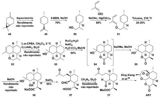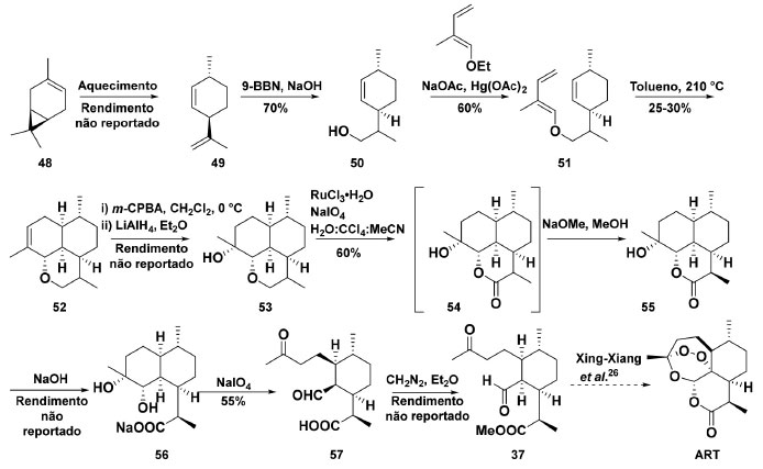 A síntese se inicia a partir do sulfóxido 41 que, após sequência de tratamento com LDA e alquilação, forneceu uma mistura diastereoisomérica que foi dessulfurizada, formando o isômero 42. A ciclohexanona 42, através do processo de Shapiro et al.33 por meio da obtenção da hidrazona correspondente e posterior estabilização do diânion com DMF, forneceu o aldeído α,β-insaturado 43. Os autores relataram que no processo de obtenção de 45 via rearranjo de Ireland-Claisen, era necessária a estereoquímica adequada do intermediário 44 para que a reação ocorresse, devido a um estado de transição congestionado de um dos diastereoisômeros. Nesse sentido, a obtenção do diastereoisômero desejado 44 foi procedida via adição 1,2 à carbonila de 43 via face Si, utilizando tris(trimetilsilil) alumínio eterato, fornecendo o alcóxido α-silil alumínio, que foi estabilizado in situ por meio de anidrido acético em ótimo rendimento. De posse do silil-acetato 44, o vinilsilano 45 foi obtido através do rearranjo de Ireland-Claisen e posteriormente esterificado, alquilado e hidrolisado ao ácido carboxílico 47. Por fim, através do processo de ozonólise de Buchi e Wuest em meio ácido, a ART foi obtida em 37% de rendimento. As reações pericíclicas, em especial a cicloadição, foram exploradas por Ravindranathan e colegas em 1990 como uma maneira criativa de obter a ART (Esquema 5).34 A estratégia para emprego da cicloadição de Diels-Alder intramolecular se baseia na obtenção do intermediário avançado 51, que contém o dieno e dienófilo necessários para interação orbitalar e consequente ciclização. Inicialmente, o (+)-car-3-eno (48) por meio de um rearranjo térmico foi convertido em isolimoneno (49) e em seguida submetido à reação de hidroboração da dupla ligação menos impedida estericamente, fornecendo o álcool 50. Após a formação do éter vinílico sob catálise de sais de mercúrio e sódio, o intermediário enol-éter chave para a cicloadição (51) foi obtido em 60% de rendimento. A reação de Diels-Alder intramolecular foi empregada para anelação e obtenção do intermediário 52; entretanto, vale ressaltar a ineficiência dessa etapa devido à grande diferença de energia entre os orbitais de fronteira HOMO-LUMO, requerendo altas temperaturas e 72 horas de reação, fornecendo uma mistura de isômeros (52) com rendimentos entre 25 30%. Em seguida, a reação de Prilezhaev foi empregada para formação do epóxido, que foi aberto dando origem ao álcool 53. A etapa de funcionalização da ligação C-H de 53 para formação da carbonila foi promovida em condições oxidantes mais vigorosas, via tetróxido de rutênio obtido in situ, fornecendo a lactona 54 em 60% de rendimento. Ela foi então epimerizada para o diastereoisômero com estereoquímica desejada (55), com a subsequente hidrólise básica fornecendo 56. A clivagem do diol presente em 56 foi realizada com periodato de sódio fornecendo em 55% de rendimento o composto 57, que contém as funções cetona e aldeído necessárias para o fechamento de anel ácido catalisado do sistema trioxânico. Como o intermediário 37 já havia sido obtido em metodologia anterior, as mesmas condições reacionais de proteção, desproteção, uso de oxigênio singleto por via fotoquímica e catálise ácida descritas por Xing-Xiang levaram à ART.26 Vale ressaltar que essa síntese formal forneceu em 8 etapas o intermediário 37, ao passo que no estudo descrito por Xing-Xiang este foi obtido em 15 etapas.