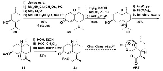 Em uma segunda síntese formal, o mesmo grupo anterior utilizou uma etapa de oxidação C-H não usual.35 Partindo do (-)-mentol (58), foi obtida a enona correspondente 59 em 4 etapas com rendimento de 39% (Esquema 6). Posteriormente, a epoxidação da ligação dupla endocíclica e a abertura do epóxido com concomitante redução da carbonila, levaram ao intermediário 60, com estereoquímica cis na fusão de anéis, em 94% de rendimento. Após a acetilação da hidroxila menos impedida estericamente, a oxidação C-H do fragmento isopropila por meio de um processo radicalar fotocatalisado, publicada por Vallés e colaboradores,36 levou à formação do anel tetraidrofurânico presente em 61 em 80% de rendimento. Em seguida, 61 foi desprotegido, oxidado com clorocromato de piridínio (PCC) e sua hidroxila protegida para obtenção do intermediário avançado 33, também utilizado e reportado por Xing-Xiang26 para obtenção da ART.