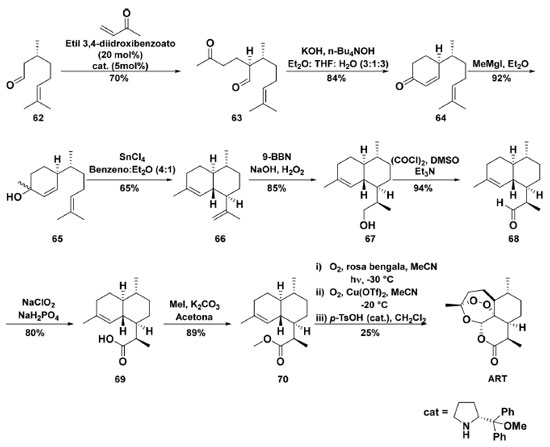 O trabalho pioneiro publicado por Yadav e colaboradores em 2010 otimizou a rota sintética da ART ao obter o intermediário avançado 70, semelhante ao ADA, em 7 etapas, metade do número de etapas descritas por Xing-Xiang26 e sem o emprego de grupos de proteção (Esquema 7).37 A síntese se inicia com a adição 1,4 da enamina formada pelo (R)-(+)-citronelal (62) e catalisador de derivado de prolina à metil vinil cetona fornecendo o intermediário 63. Em seguida, este sofre uma condensação aldólica intramolecular fechando o anel presente em 64, que subsequentemente é submetido a uma adição de organometálico à carbonila formando a mistura de diastereoisômeros 65. O processo de desidratação/ciclização promovido por tetracloreto de estanho forneceu o biciclo 66, que foi submetido a uma hidroboração regiosseletiva na ligação dupla exocíclica utilizando o 9-borabiciclo[3.3.1]nonano (9-BBN). O álcool 67 foi convertido ao aldeído através da oxidação de Swern e este ao ácido carboxílico 69 através da oxidação de Pinnick e com a subsequente esterificação em meio básico conduzido à 70. O intermediário avançado 70 foi submetido às condições de ciclização utilizando o protocolo descrito por Vonwiller et al.,38 fornecendo então a ART. Segundo os autores, essa metodologia poderia ainda ser otimizada através da oxidação/esterificação one-pot. A organocatálise assimétrica até então não havia sido explorada em metodologias de obtenção da ART, mas apesar de apresentar vantagens e potencial utilização na obtenção industrial, apenas 27 mg da ART foram obtidas, necessitando avaliar a escalabilidade do processo.