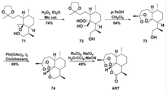 As metodologias de obtenção da ART até então enfrentavam um problema sintético bastante desafiador: a incorporação do fragmento peróxi/hidroperoxil de maneira estereosseletiva na posição C-12 do sistema sesquiterpênico, a qual é considerada impedida estericamente (Figura 1, B).39 Até então, para essa etapa chave, todas as metodologias utilizavam oxigênio singleto, ozônio ou hidroxiperoxisilanos (espécies de meia vida curta obtidas a partir do ozônio). A despeito do peróxido de hidrogênio (H2O2) ser um reagente bastante conhecido para incorporação desse fragmento em compostos orgânicos, não havia um procedimento para sua utilização na síntese da ART que houvesse funcionado, ou até mesmo para outros intermediários avançados. Nesse sentido, Hao e colaboradores desenvolveram uma metodologia que utilizou H2O2 sob catálise de sais de molibdênio (Esquema 8).39 Através da otimização das condições reacionais com um substrato modelo, a metodologia foi aplicada ao intermediário avançado 71 e foi observado que a perhidrólise acontecia de maneira diastereosseletiva frente ao grupo epóxido, levando à incorporação do fragmento hidroperóxido, presente em 72. Em meio ácido, ocorre a desproteção do grupo acetal e fechamento do anel, levando ao derivado 73, que contém o sistema 1,2,4 trioxânico de interesse. Em duas etapas subsequentes, os autores obtiveram a ART, expandindo a possibilidade do uso desse reagente mais acessível e sem a necessidade de aparato fotoquímico sofisticado.