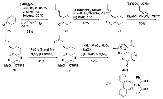 Em 2012, Zhu e Cook descreveram a síntese total da ART de maneira concisa e econômica, em apenas 5 etapas, utilizando como precursor a ciclohexenona 75, amplamente disponível e de baixo custo (Esquema 9).40 Em metodologias anteriores, a etapa de alquilação utilizando o vinilsilano de Stork-Jung ainda era custosa, sendo então substituída pelos autores por uma reação SN2 com brometo de crotila, que através de uma oxidação olefínica do tipo Wacker, forneceu a cetona desejada 76. Além disso, os autores partiram da premissa de que obtendo o derivado α,β-insaturado 77, poderiam explorar cicloadições do tipo [4+2] de maneira mais eficiente. Também não foram empregadas reações de proteção/desproteção e, com escalonamento moderado, a complexidade de obtenção da ART diminui, tornando o processo mais atrativo no contexto de obtenção industrial.