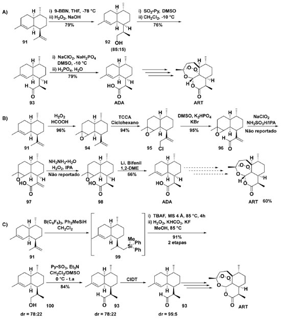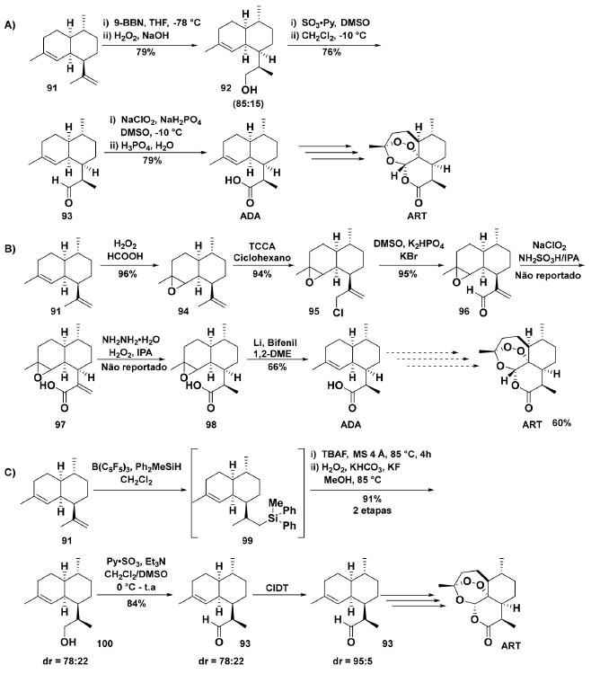 Em 2006, a indústria Amyris, em colaboração com pesquisadores da Universidade da Califórnia Berkeley, desenvolveu um processo fermentativo para obtenção do AAR em escala industrial.49 A tecnologia desenvolvida pelos grupos baseou-se na modificação genética de leveduras Saccaromyces cerevisiae (EPY224), manipulando-as para expressar a sintase do amorfadieno e uma monooxigenase do complexo do citocromo P450, que seriam capazes de converter o amorfadieno (91) em AAR, partindo de açúcares simples. Através do processo desenvolvido, foi possível aumentar a produção do amorfadieno em mais de 500 vezes quando comparadas às concentrações obtidas naturalmente.50 Uma das vantagens do processo é que a obtenção desse metabólito de interesse não mais estaria sujeita às variações climáticas quando comparadas à sua extração vegetal, e que em poucas etapas levaria à ART. Assim, Westfall e colaboradores utilizaram 91, obtido através do processo fermentativo descrito acima, para a etapa de hidroboração usando 9-BBN, que forneceu o álcool correspondente 92 na configuração desejada em 79% de rendimento (Esquema 12, A).49 A oxidação do álcool 92 diretamente a um ácido carboxílico em uma única etapa levou a misturas complexas que, segundo os autores, poderiam ser fruto da reatividade da olefina originando subprodutos. Nesse sentido, a oxidação de Parikh-Doering foi utilizada para converter o álcool 92 no aldeído 93 em 76% de rendimento e, em seguida, no ADA, com 79% de rendimento, via reação de Pinnick. Assim, o ADA poderia ser utilizado como intermediário para obtenção da ART no contexto industrial.