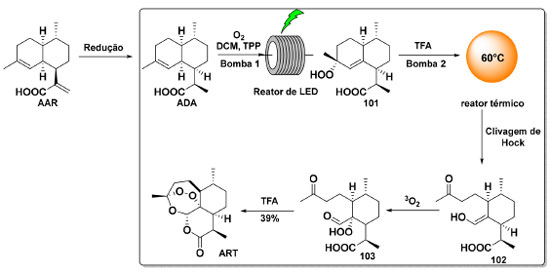 ![]() Esquema 13. Representação esquemática da síntese em fluxo contínuo da ART desenvolvida por Lévesque e Seeberger