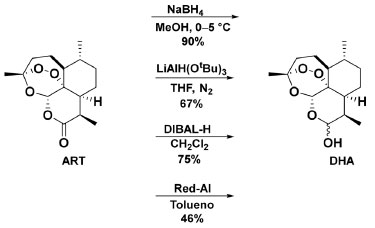 ![]() Esquema 14. Principais metodologias de redução para obtenção dos derivados da ART. Red-Al - diidro bis(2-metoxietanolato) aluminato de sódio