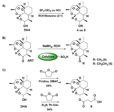Os derivados da ART, utilizados ou não em combinação com outros medicamentos para tratamento da malária, são sintetizados a partir da DHA, através da funcionalização da hidroxila anomérica. As reações promovidas por ácidos de Lewis se mostraram um método conveniente para a síntese dos primeiros derivados, ainda que nem sempre bons rendimentos eram obtidos, principalmente associados a fragilidade da subunidade endoperoxídica ou até mesmo a formação de subprodutos.7 Para os derivados metoxilados e etoxilados, arteméter (4) e arteéter (5), a reação com eterato de trifluoreto de boro (BF3·OEt2) em álcool/benzeno (2:1) foi inicialmente utilizada (Esquema 15, A), mas a substituição desse ácido de Lewis por ácido clorídrico é preferível devido ao menor custo e rendimentos semelhantes.61