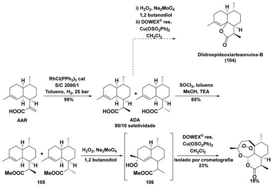 Entretanto, essas metodologias também estão associadas a alguns inconvenientes, tais como: carcinogenicidade do benzeno, manuseio de ácidos de Lewis perigosos em grande escala e a necessidade de uma etapa de purificação por cromatografia para isolar o isômero β desejado, sem mencionar que são duas etapas sintéticas separadas. Nesse sentido, Kumar e Bishnoi desenvolveram em 2014 uma metodologia para redução/eterificação da ART em um processo in situ com o emprego de celulose ácida, considerada biodegradável e com boa reciclabilidade (Esquema 15, B).62 Os autores conseguiram obter os produtos 4 e 5 em ótimos rendimentos, sendo 5 o substrato utilizado para padronização das condições reacionais: 82% sem a necessidade de purificação por cromatografia, um incremento quando comparado ao rendimento global descrito inicialmente de 59%.61 O artesunato (6) foi obtido inicialmente por meio da reação com anidrido succínico em piridina, na presença de dimetilaminopiridina (DMAP) em quantidade catalítica, fornecendo o produto em até 65% de rendimento (Esquema 15, C). Em 2017, Presser e colegas publicaram um procedimento visando a escalabilidade e condições verdes para obtenção de 6.63 O autor utilizou trietilamina como base, ao invés da piridina, e acetato de isopropila, o qual poderia ser reutilizado, fornecendo o éster correspondente 6 em 94% de rendimento. Da síntese em bancada para a indústria: avanços na obtenção da artemisinina e seus derivados em larga escala Em 2002, a Organização Mundial de Saúde (OMS) preconizou terapias baseadas nas associações da ART para o tratamento de malária não complicada.64 Essa decisão causou um aumento na demanda por essa matéria prima afetando tanto os preços quanto a disponibilidade. Até então, a ART era obtida industrialmente através de processos extrativos vegetais, haja vista que as sínteses totais ou semissínteses publicadas até então se limitavam à escala laboratorial acadêmica (múltiplas etapas e alto custo). Diante disso, houve um incentivo para a busca de novas metodologias de obtenção da ART em escala industrial a partir de microrganismos para atender de maneira eficiente a demanda dessa classe de compostos.65 Assim, partindo do AAR obtido através de processos fermentativos aprimorados,50 a primeira etapa sintética descrita pela Amyris compreendeu a hidrogenação diasterosseletiva do sistema acrílico (Esquema 16). Ainda que o uso de níquel e borohidreto de sódio já havia sido relatado,46 com diastereosseletividade modesta de 85:15 em relação a mistura de isômeros R/S do ADA, o emprego do catalisador de Wilkinson forneceu uma conversão quase quantitativa, com diastereosseletividade de 90:10 para a estereoquímica desejada.66 Já se sabia que a peroxidação direta deste levava à lactona de 5 membros diidroepideoxiarteannuina-B (104) e, consequentemente, acarretaria rendimentos inferiores da ART.54 Assim, os autores optaram por converter o ADA em seu respectivo éster metílico,54 primeiro ativando o grupo carbonila através do seu respectivo cloreto de acila e posterior tratamento com metanol para obtenção do éster 105. A incorporação do hidroperóxido na posição alílica presente em 106 foi realizada através da geração de oxigênio singleto por desproporcionação do peróxido de hidrogênio utilizando sais de metais do grupo VI via reação de Aubry, processo esse otimizado a partir do trabalho pioneiro de Hao em 2011.39 A escolha dessa metodologia foi devida ao custo de reações fotocatalizadas em plantas de manufatura e o oxigênio empregado foi substituído por ar atmosférico por questões de segurança. Finalmente, a etapa final de ciclização foi realizada utilizando resina DOWEX®, substituindo o caro triflato de cobre utilizado em outras sínteses. Esse processo implementado em escala semi-industrial foi capaz de prover a ART com um rendimento global de 19%, demonstrando ainda a necessidade de eventuais otimizações.