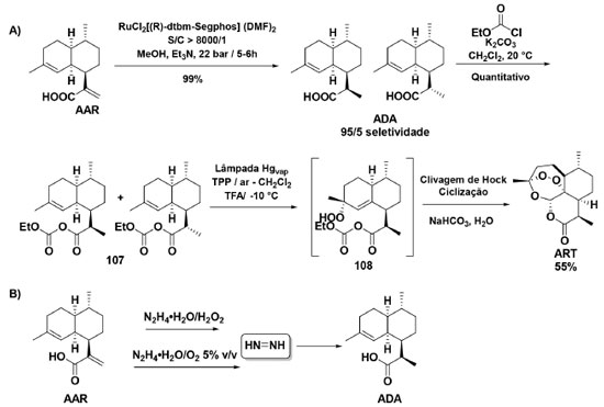 Após a transferência da tecnologia da Amyris para a Sanofi, muito se fez para industrializar o processo nos anos seguintes, principalmente no que diz respeito às etapas de hidrogenação e o processo fotoquímico para obtenção do oxigênio singleto.67 A primeira estratégia adotada pela Sanofi foi combinar a diastereosseletividade inerente do AAR com um catalisador quiral que poderia favorecer um melhor excesso diastereoisomérico na etapa de hidrogenação, em virtude do alto custo do ródio, que tornava o processo nada atrativo em escala industrial. Assim, em parceria com a indústria japonesa Takasago, foram testados catalisadores e, dentre eles, o RuCl2[(R)-DTBM-Segphos](DMF)n se mostrou bastante eficaz e com alta diastereosseletividade (Esquema 17, A).
