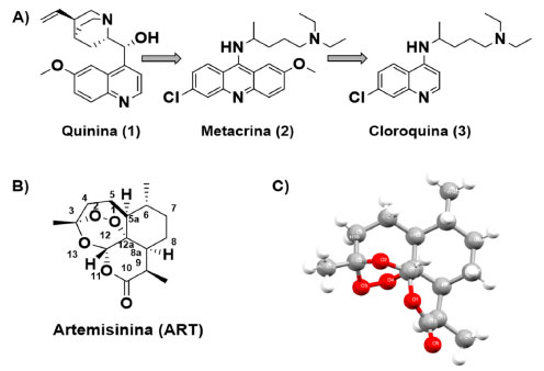 ![]() Figura 1. A) Primeiros antimaláricos descritos a partir da quinina (1): metacrina (2) e cloroquina (3). B) Estrutura química da (+)-artemisinina (ART). C) Representação ORTEP. Ilustração gerada com o software Mercury,14 depósito do cristal CCDC 754897