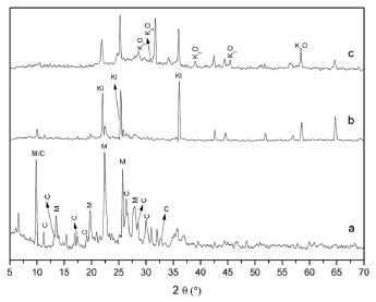 ![]() Figura 1. Difratograma da Zeólita (a); KI/Zeólita (b); K2O/Zeólita. KI= Iodeto de Potássio; K2O= Óxido de Potássio; M= Mordenita; C= Clinoptilolita