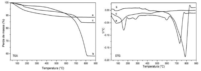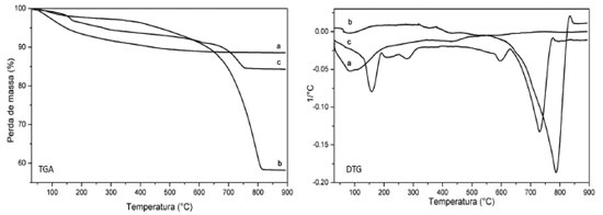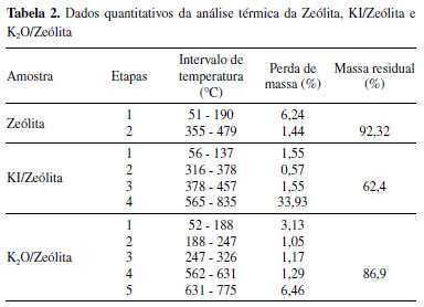 As curvas TGA/DTG da Zeólita, KI/Zeólita e K2O/Zeólita estão apresentadas na Figura 2. As curvas das amostras Zeólita, KI/Zeólita e K2O/Zeólita apresentam três perdas de massa abaixo de 500 °C, cujos valores são de 6,2%, 1,5% e 3,1%, respectivamente. O primeiro evento foi observado no intervalo de temperatura entre 50 a 190 °C, correspondente à água absorvida mediante pontes de hidrogênio na superfície da zeólita.42