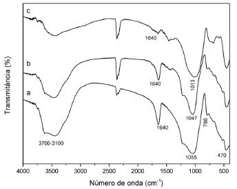 ![]() Figura 3. Espectro de FTIR da Zeólita (a), KI/Zeólita (b) e K2O/Zeólita (c)