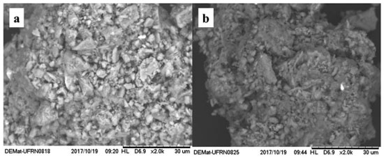 Nos espectros de todas as amostras estão presentes bandas na região de 3700 cm-1 a 3100 cm-1 e a banda 1640 cm-1 atribuídas às vibrações de alongamento e flexão dos grupos hidroxilas da água absorvida no material, respectivamente.45 Nas amostras KI/Zeólita e K2O/Zeólita observa-se que a banda 1640 cm-1 apresentou diminuição de sua intensidade com relação a Zeólita sendo um indicativo da substituição das interações das moléculas de água pelas interações com o KI e K2O, respectivamente.46 A absorção em destaque na região de 1055 cm-1, para a amostra Zeólita, é caracterizada pelas ligações T-O-Si (T=Si ou Al), no entanto para as amostras KI/Zeólita e K2O/Zeólita essas bandas apresentam deslocamento para as regiões em 1047 cm-1 e 1013 cm-1, respectivamente. Esse comportamento sugere a presença do KI e K2O na estrutura do suporte.47 Por fim, as bandas 766 cm-1 e 470 cm-1 equivalem às vibrações de estiramento e reflexão das ligações O-Si-O e das vibrações de torções das ligações Al-O-Si, na devida ordem.42 As imagens de microscopia eletrônica de varredura (MEV) da Zeólita e K2O/Zeólita foram ilustradas na Figura 4 (a) e 4 (b), nesta ordem. De acordo com a imagem da Zeólita observa-se a presença de aglomerados de estrutura lamelar, bem como grãos de tamanhos diferenciados,48 além de apresentar uma superfície irregular com elevada rugosidade fornecendo uma alta quantidade de cavidades na estrutura do material, propriedades estas da Zeólita Clinoptilolita.49 Observam-se também a presença de aglomerados esféricos, aglomerados de faces cristalinas e uma estrutura cristalina em forma de agulha, características da Zeólita Mordenita.44,50