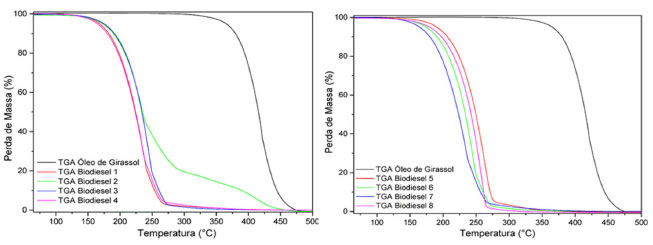 ![]() Figura 5. TGA do Óleo de Girassol e do Biodiesel 1; Biodiesel 2; Biodiesel 3; Biodiesel 4; Biodiesel 5; Biodiesel 6; Biodiesel 7; Biodiesel 8