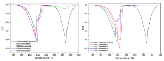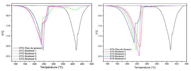 ![]() Figura 6. DTG do Óleo de Girassol e do Biodiesel 1; Biodiesel 2; Biodiesel 3; Biodiesel 4; Biodiesel 5; Biodiesel 6; Biodiesel 7; Biodiesel 8