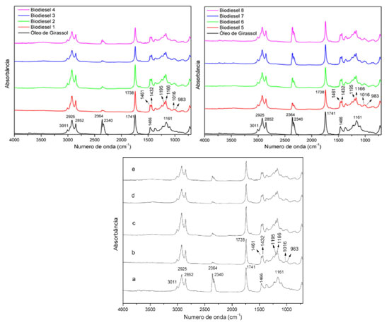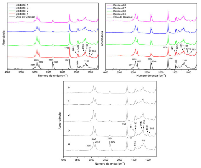 ![]() Figura 7. Espectros de FTIR do Óleo de Girassol e do Biodiesel 1; Biodiesel 2; Biodiesel 3; Biodiesel 4; Biodiesel 5; Biodiesel 6; Biodiesel 7; Biodiesel 8