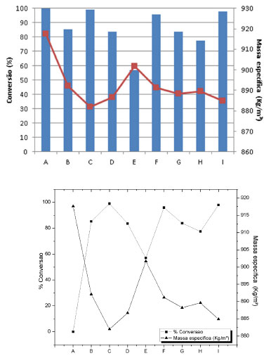 ![]() Figura 8. Gráfico entre a relação da % de conversão e da massa específica do Óleo de girassol (A); Biodiesel 1 (B); Biodiesel 2 (C); Biodiesel 3 (D); Biodiesel 4 (E); Biodiesel 5 (F); Biodiesel 6 (G); Biodiesel 7 (H); Biodiesel 8 (I)