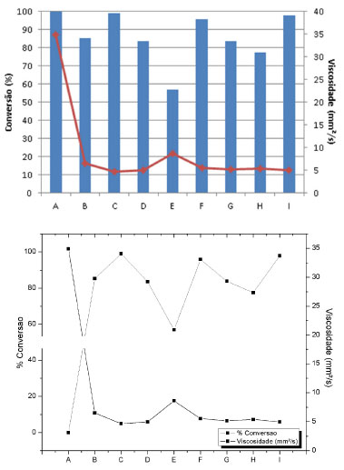 ![]() Figura 9. Gráfico entre a relação da % de conversão e da viscosidade do Óleo de girassol (A); Biodiesel 1 (B); Biodiesel 2 (C); Biodiesel 3 (D); Biodiesel 4 (E); Biodiesel 5 (F); Biodiesel 6 (G); Biodiesel 7 (H); Biodiesel 8 (I)