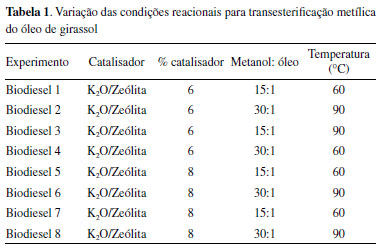 As reações foram realizadas em um balão de fundo chato de 500 mL conectado a um condensador, sob agitação constante. Ao fim da reação, a mistura foi filtrada para a remoção do catalisador heterogêneo. Em seguida, o filtrado foi vertido em um balão de separação, fornecendo um tempo de espera de 24 h para que todas as fases existentes fossem separadas. Após a separação completa das fases, os subprodutos mais densos foram removidos do balão e o biodiesel foi lavado primeiramente com solução salina 10%, seguida por sucessivas lavagens com água destilada aquecida a 40 °C. Por fim, o biodiesel foi seco a 100 °C por 3 h. Caracterização do Óleo e do Biodiesel de girassol O óleo e as amostras de biodiesel de girassol obtidas em diversas condições foram analisados por índice de acidez, viscosidade, densidade, análise termogravimétrica (TGA/DTG) e infravermelho por transformada de Fourier (FTIR). A análise termogravimétrica (TGA/DTG) do óleo e dos biodiesels foi realizada em um analisador térmico, marca TA Instruments, modelo SDT Q-600 com taxa de aquecimento de 10 °C min-1, iniciando a análise em 30 °C até 600 °C, utilizando atmosfera de nitrogênio com um fluxo de gás de 50 mL min-1 e 10 mg de amostra em um cadinho de alumina. Os espectros de absorção no infravermelho do óleo e dos biodiesels foram realizados usando o espectrofotômetro de infravermelho por transformada de Fourier (FTIR) Shimadzu IRAffinity-1 na faixa de frequência de 700 a 4000 cm-1. As análises das amostras foram realizadas inserindo 0,1 mL de amostra em pastilha de alumina. O índice de acidez foi realizado de acordo com método ASTM D664 por meio da titulação. Em um erlenmeyer, de 125 mL, foram colocados 25 mL da solução (2:1) de éter e álcool etílico com 3 gotas de fenolftaleína (indicador) e em uma bureta foi colocada uma solução de NaOH 0,1 N. Primeiramente foi realizada a titulação do branco e em seguida, nesse mesmo sistema titulado, foi colocado 2 g da amostra para uma seguinte titulação. Para realizar os cálculos do índice de acidez, os dados obtidos do experimento foram substituídos na Equação 1. ![]() em que: IA = índice de acidez; VA = volume (mL) da solução de NaOH a 0,1N gasto na titulação da amostra; VB = volume (mL) da solução de NaOH gasto na titulação da solução solvente (branco); Ct = concentração (N) da solução de NaOH obtida na padronização e m = massa (g) da amostra. As análises de viscosidade e massa específica foram realizadas simultaneamente através do viscosímetro, marca Anton Paar, modelo SVM 3001 Stabinger Viscometer, conforme metodologias ASTM D4052 para a massa específica e ASTM D445 para a viscosidade. A análise foi realizada inserindo-se 2 mL da amostra no equipamento, preenchendo duas células, uma para analisar a viscosidade e outra para analisar a massa específica. Os resultados são obtidos após a espera do tempo de estabilização das temperaturas de análises de 20 °C para a massa específica e 40 °C para a viscosidade.