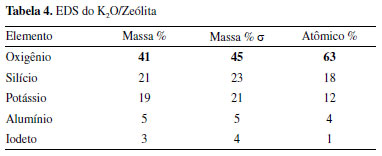 Observa-se também que a Zeólita (Figura 4a) apresenta poros, bordas afiadas com diversos espaços vazios entre as partículas e a K2O/Zeólita (Figura 4b) mostra esses poros e espaços vazios, ao qual podem ser ocupados por potássio durante a impregnação. Essa ocorrência também foi relatada no estudo da impregnação do KOH para posterior conversão em K2O na Zeólita por Taslim et al.46 Os valores dos elementos presentes no K2O/Zeólita obtida pela espectroscopia por energia dispersiva (EDS) estão listados na Tabela 4. Nota-se que a quantidade de potássio no material é elevada enquanto o teor de iodeto é praticamente desprezível, apontando como indicativo da eficiência do processo de calcinação da conversão do KI em K2O.