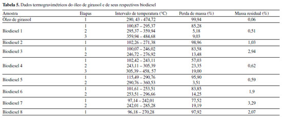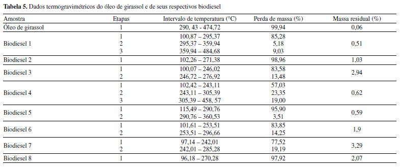 O segundo evento de perda de massa presente em todas as amostras de biodiesel, exceto nas amostras de biodiesels 2 e 8, foi verificado na faixa de 240 a 360 °C e refere-se a decomposição térmica dos diglicerídeos.53 Enquanto que a terceira etapa de perda de massa, presente nas amostras de biodiesels 1 com perda de massa de 9,0% e biodiesel 4 com perda de massa de 19,0%, correspondente à faixa de temperatura de 360 a 480 °C, relaciona-se aos triglicerídeos que não converteram-se em ésteres durante a reação de transesterificação.54 Os dados estão resumidos na Tabela 5.