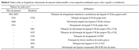 Na Figura 7 apresentam-se os espectros na região do infravermelho correspondente ao óleo de girassol e os biodiesels. De acordo com os espectros, observa-se, tanto para o óleo quanto para os biodiesels, a presença das bandas na região entre 2852 cm -1 a 3011 cm-1 sendo atribuídas as vibrações de alongamento simétricas e assimétricas das ligações C-H dos grupos metil.55 O espectro do óleo de girassol mostrou uma banda em 1741 cm-1, por outro lado, nos espectros dos biodiesels essa banda foi observada em menores números de onda em 1738 cm-1 devido à formação de ésteres metílicos de cadeias menores do que as cadeias dos ésteres do óleo. Essas bandas são correspondentes às vibrações das ligações C=O dos grupos ésteres.56 As bandas 1466 cm-1 e 1161 cm-1 presentes no óleo de girassol são atribuídas à deformação angular das ligações C-H dos alcanos e ao alargamento da ligação C-O do grupo éster, respectivamente.54 O aparecimento bandas 1461 cm-1 e 1432 cm-1 nos espectros de biodiesel estão relacionados com as vibrações de deformação da ligação C-H dos grupos CH3 e CH2.57 Outras bandas em 1195, 1166 e 1016 cm-1 correspondem às vibrações de alongamento O-CH3, à formação de ésteres metílicos de ácidos graxos e vibrações das ligações C-O e C-O-C no espectro do biodiesel, respectivamente.58,59 A absorção na região de 983 cm-1 descreve a deformação das ligações insaturadas (HC=CH) fora do plano (Tabela 6).60