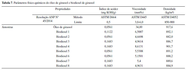 A inexistência de absorções na região entre 3200 cm-1 e 3640 cm 1, que caracteriza o estiramento de ligações O-H tanto para água como para álcool, sugere a eficiência na lavagem do biodiesel para remoção de álcool bem como no processo de sua secagem para a remoção da água.61 Os valores obtidos dos ensaios dos parâmetros físico-químicos do óleo de girassol e dos biodiesels são apresentados na Tabela 7. Os valores de índice de acidez correspondentes ao biodiesel estão dentro do limite imposto pela Resolução ANP N° 45/2014, de 0,5 mg KOH/g, entretanto, seus valores foram iguais ou maiores que o óleo vegetal, isso pode ser atribuído ao fato da instabilidade do biodiesel à oxidação. Os óleos vegetais possuem antioxidantes naturais, os tocoferóis, no entanto, quando esses óleos sofrem reações para serem convertidos a biodiesel, esses antioxidantes são eliminados tornando o biodiesel instável à oxidação, resultando na elevação do seu índice de acidez.62 O valor do índice de acidez para o óleo de girassol apresentou discordância com os valores de Hoha et al.63 em que apresentou índice médio de 0,35 mg KOH/g. Por outro lado, os valores de índice de acidez dos biodiesels apresentaram valores próximos dos dados de Westhuizen e Focke64 em que constaram para as duas amostras de biodiesel sintetizadas 0,1 e 0,06 mg KOH/g.