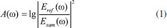 Sample preparation The experimental samples were purchased from Shanghai Macleans Biochemical Technology Co., Ltd., and the purity was 98%, which met the experimental requirements. The sample was placed in a vacuum constant temperature drying oven at 50 °C to dry for about 2 hours to remove residual moisture. The samples were respectively mixed with polyethylene powder (mass ratio 3:1), and ground in a mortar. Then use the FW-4A tablet press (the pressure value is adjusted to 12 Mpa) to compress the samples into uniform sheets with a thickness of about 1.2 mm and a diameter of 13 mm.14 Data processing The reference signal and sample signal obtained in the experiment are converted into the corresponding frequency domain signal by the fast Fourier transform (FFT). The absorbance, absorption coefficient, and refractive index are essential optical parameters that describe the macroscopic optical properties of the research object. These parameters can be obtained based on the optical parameter model proposed by Duvillaret and Dorney.15,16 The absorbance is used to process the experimental data. The absorbance represents the degree to which the THz wave is absorbed by the sample. It is a relative quantity and dimensionless. According to the description of the Fresnel formula, the absorbance A(ω) parameter can be obtained by the following formula.17 ![]() where Esam(ω) is the THz amplitude of the sample, Eref(ω) is the THz amplitude of the reference, and ω is the circular frequency. The THz absorption spectra of 4- and 5-hydroxysalicylic acid were plotted via Origin software after the processing described above.