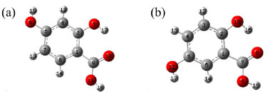 ![]() Figure 1. Monomolecular structures of the hydroxysalicylic acid isomers. (a) 4-hydroxysalicylic acid. (b) 5-hydroxysalicylic acid. Atomic elements in gray, white, and red represent carbon, hydrogen, and oxygen atoms, respectively