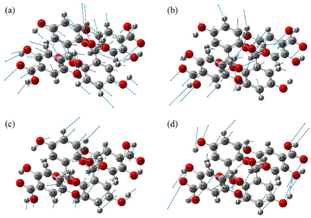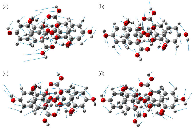 ![]() Figure 8. Vibrational modes of 4-hydroxysalicylic acid at (a)0.61 THz, (b)0.99THz, (c) 1.57 THz, and (d)2.11THz, the arrow indicates the displacement vectors