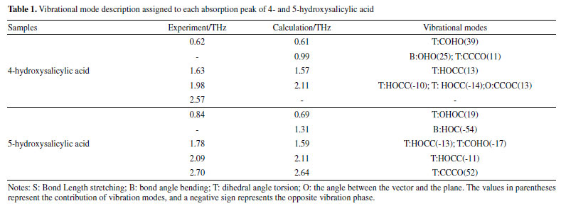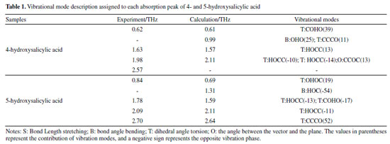 I. Guangxi Key Laboratory of Automatic Detecting Technology and Instruments, School of Electronic Engineering and Automation, Guilin University of Electronic Technology, Guilin 541004, China Recebido em: 10/01/2022 *e-mail: cclizhi@guet.edu.cn The terahertz (THz) absorption spectra of 4- and 5-hydroxysalicylic acid were measured by terahertz time-domain spectroscopy (THz-TDS) in the range of 0.4-2.8 THz. The unit cells of both were calculated by density functional theory (DFT), and the theoretical simulation and experimental data were basically in agreement. To further interpret the origin of the characteristic absorption peaks, vibration characteristics and interactions of the unit cell model were analyzed by using potential energy distribution (PED) and interaction region indicator (IRI) method. The analysis indicated that the absorption peaks of 4- and 5-hydroxysalicylic acid were mainly derived from the vibration mode of dihedral angle torsion, and were closely related to the hydrogen bonds. And the intermolecular weak interaction of both were mainly dominated in quantity by van der Waals interaction. The results show that this is an effective solution to identify isomers and explain the formation mechanism of characteristic absorption peaks by using THz-TDS and combining PED and IRI methods. INTRODUCTION 4- and 5-hydroxysalicylic acid are isomers and they are derivatives of salicylic acid, but their properties and uses are different. 5-hydroxysalicylic acid is also called gentian acid, it is a polyhydroxy carboxylic acid. It belongs to the secondary product of salicylic acid through renal metabolism. In addition, it is also an important pharmaceutical intermediate. In the pharmaceutical industry, 5-hydroxysalicylic acid is often used as an antioxidant excipient. At the same time, it is also an antipyretic and analgesic.1 4-hydroxysalicylic acid has both chemical properties of resorcinol and salicylic acid. It is mainly used as dye and pharmaceutical intermediates. The fine chemical and pharmaceutical industries need to focus on the safety and quality of synthetic intermediates, especially those with similar appearance but different physical and chemical properties. Therefore, an accurate, rapid and non-destructive method is needed to identify chemical intermediates with similar appearance but different physical and chemical properties. THz-TDS is based on femtosecond ultrafast laser technology to obtain the characteristic fingerprint spectrum of substances in THz band, and then can effectively study the characteristics of substances at low frequency.2,3 According to the investigation, the low-frequency vibration modes of many biological macromolecules are mostly caused by the collective vibration between molecules, the swing of intermolecular hydrogen bonds and the torsion of large official energy groups.4 When the sample is detected by terahertz wave, if the vibration or rotation frequency of the sample molecular structure is consistent with the terahertz frequency, resonance absorption will occur, and the formed absorption peak spectrum is unique.5 Compared with terahertz wave, Infrared and Raman spectroscopy are usually used to analyze the vibration modes of chemical bonds and functional groups, and their accuracy is low for substances from the same category as their chemical bonds and functional groups are very similar. THz wave is just in the far-infrared band, which is extremely sensitive to intermolecular interaction and surrounding environment, and it has good penetration and special spectral characteristics, which can be used in contactless identification of substances.6 In addition, weak intermolecular interactions in crystals, such as hydrogen bond stretching and torsion, fall in the terahertz band, which makes THz-TDS an effective means to study weak intermolecular interactions. Based on THz-TDS, in 2005, Yamaguchi et al.7 measured the low-frequency THz absorption spectra of alanine chiral isomers and racemates by using THz-TDS. It was found that the absorption peak positions of alanine with different structures were significantly different. In 2012, Zheng et al.8 measured the absorption spectra of catechol, resorcinol and hydroquinone by using THz-TDS, and found that they had their own absorption peaks in the effective THz band. Salicylic acid is an important organic synthetic raw material, which is widely used in medicine, pesticide, rubber, dye, food and flavor industries.9-11 It has attracted many scholars at home and abroad to study its terahertz spectral characteristics, but there are few reports on the terahertz spectral characteristics of its hydroxyl derivatives. 4- and 5-hydroxysalicylic acid are the important pharmaceutical intermediates. And it has great significance to study the formation mechanism of its THz spectral absorption peaks for the research on the biochemical function of drugs and the synthesis and development of new drugs. Figure 1 shows the single-molecule model structures of 4- and 5-hydroxysalicylic acid.