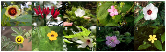 ![]() Figure 1. Pavonia plants. A) P. alnifolia, B) P. multiflora, C) P. fruticosa, D) P. malacophylla, E) P. hastata, F) P. varians, G) P. procumbens, H) P. urens, I) P. odorata, J) P. spinifex