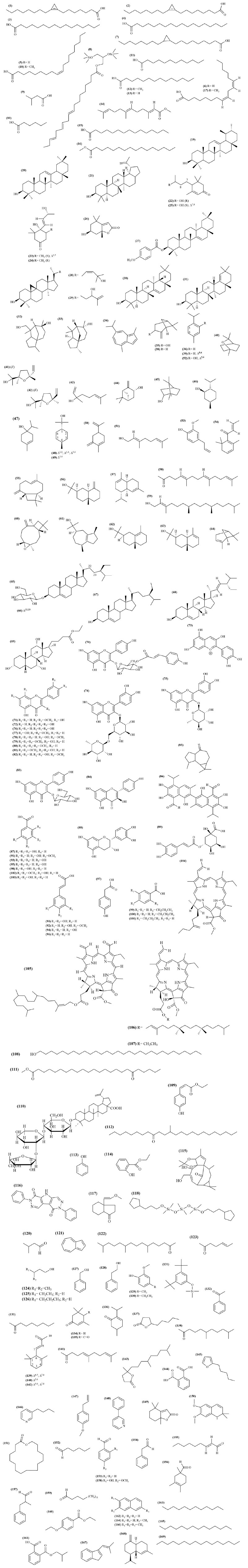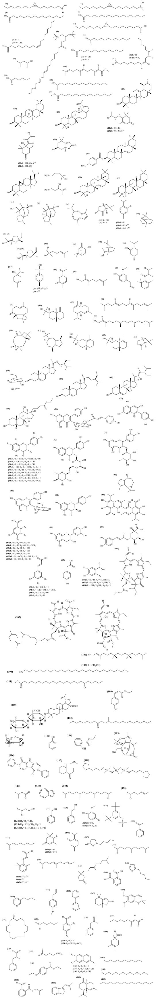 Fat acids, terpenoids, steroids, flavonoids, phenolics and other compounds such as pheophytins, hydrocarbons and volatile oils are some of the substances that can be found in the genus Pavonia. A broad profile of such compounds within has been detected in a study of the chemical composition of oils in the aerial parts of the species Pavonia odorata through hyphenated gas chromatography techniques coupled with mass spectrometry.105 All compounds and their chemical structures are related in Table 2 and Figure 2, respectively.