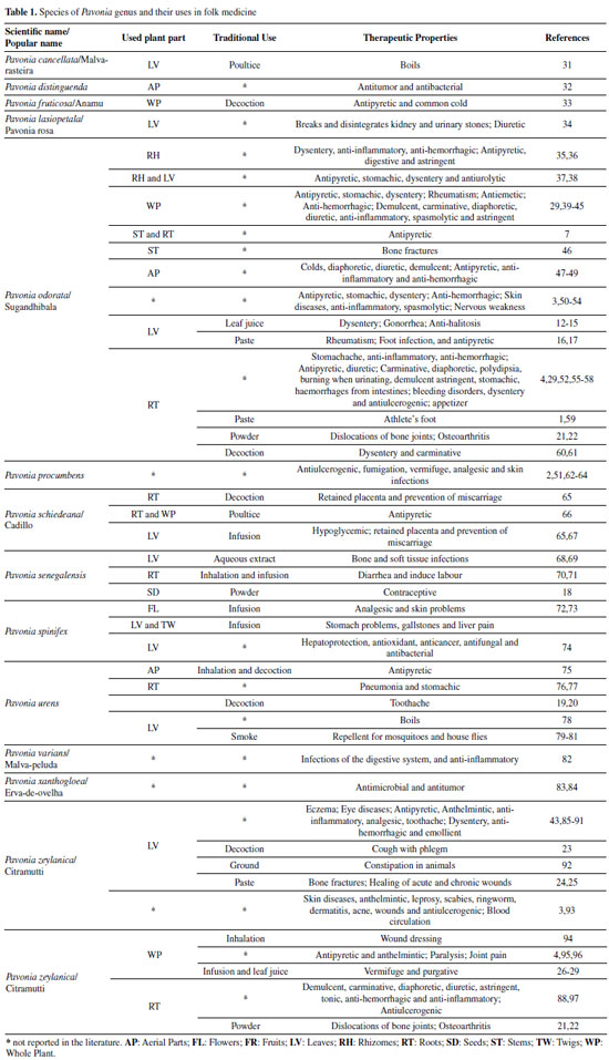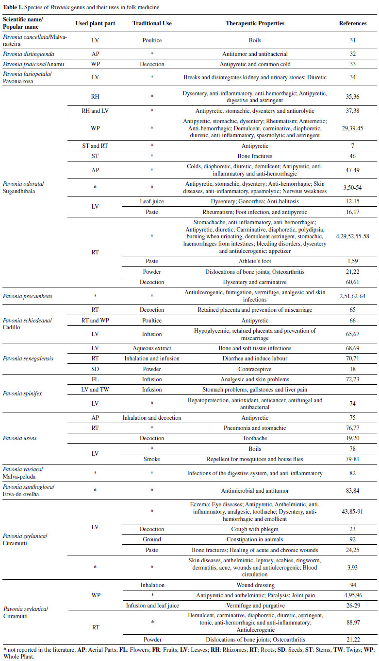 METHODOLOGY Information about the use of plants by folk medicine, phytochemical studies, botanic characteristics and pharmacological activities of genus Pavonia have been based and collected from scientific data banks such as: 'Web of Science', 'Scifinder', 'Pubmed' and 'Scholar Google', using papers, books, dissertation and thesis from the year 1918 until April 2021 and searching for the keyword 'Pavonia'. Following this methodology, we consulted 156 scientific articles, having, as inclusion criteria, the presence of information regarding the use of Pavonia genus in traditional medicine, phytochemical studies, pharmacological and/or biological activities. The exclusion criteria of the articles involved repetition of those in different databases, review articles that contained references used in the manuscript, information with the keyword 'Pavonia' that do not concerns the genus, articles with only botanical data or articles not available for access on the platforms used. A single patent referring to the species P. schiedeana (JP 2001181172A (2001)) was found as part of a cosmetic composition. The development of this revision paper aimed the study of this genus in order to expand the scientific interest through knowledge of isolated compounds with several biological activities, as those are the candidates to new drugs isolated from Pavonia species. The present study and data have been extracted by the author (JBLA) and confirmed by other (DAF, CMS, PIVS, MFVS). All data are resumed in tables and their descriptions have been resumed as updated information.