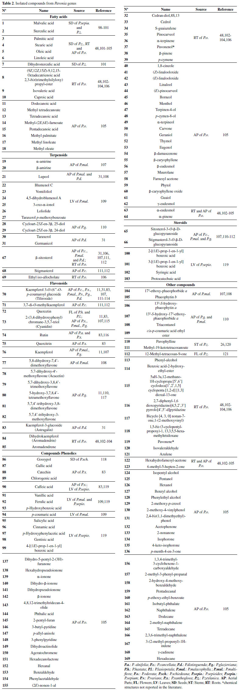 Juice of P. odorata leaves is used by traditional medicine Ayuverda as a treatment for dysentery, gonorrhea and halitosis, whereas leaves macerate as a paste are used as a treatment for rheumatism, foot infections and antipyretic.13-18 Powder from seeds of P. senegalensis is used as a contraceptive.19 Decoct of P. urens roots is largely used as a treatment for toothache.20,21 Brewing of roots and leaves of P. zeylanica, as well as decocts, powder and pastes are largely used by eastern communities as a treatment for osteoarthritis, joint pain, bone fractures, cough with discharge and healing of wounds.22-26 Leaves' juice and the entire plant prepared as infusion are also used for its vermifuge and purgative properties.27-30 Several ethnopharmacological studies regarding Pavonia species have been described in literature, which give us basis for deepening the chemical and pharmacological knowledge of those herbs, since many of the pharmacological activities are related to traditional use of medicinal plants, therefore providing essential information to the development of new drugs. Chemical composition Based on literature data, 29 references in the area of phytochemistry have been find to species of the genus Pavonia: 10 papers referred to species P. odorata (06) and P. zeylanica (04); 9 papers referred to species P. malacophyla (03), P. glazioviana (03) and P. sepium (03), and; 2 papers referred to P. cancelatta. Besides, several other papers have been related in this field with the species P. varians, P. xanthogloea, P. sepioides, P. distinguenda, P. multiflora, P. hastata, P. lasiopetala, P. schiedeana and P. alnifolia. 169 compounds have been isolated and/or identified in the genus Pavonia (Table 2), comprehending the most diverse classes of secondary metabolites ever related.