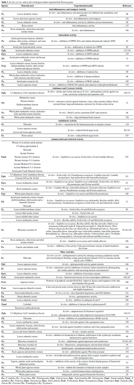 CONCLUSIONS Pavonia Cav. is one of the largest genus on Malvaceae sensu lato family and has showed different biologic activities amongst its species, which have already been mentioned in literature and scientific proved. Studies have shown that fatty acids, terpenoids, flavonoids and phenolics are the most common classes of secondary metabolites on this genus. Pharmacological in vivo, in vitro and in silico tests have given the researches promissory results due to the presence of those compounds, both isolated and present on the extracts, corroborating the reports of use of those herbs in folk medicine. Nonetheless, there is a major need of keep exploring chemical and biological potentials of Pavonia species, both already and never studied, since medicinal plants are almost inexhaustible sources of bioactive molecules that can help the treatment and cure of several diseases that affect human populations worldwide. This paper is a database with very relevant information from both phytochemical and biological studies of Pavonia species that can be further explored, aiming to understand the use of Pavonia by traditional medicine in various diseases, becoming alternatives for therapies by the use of these natural products with emphasis on the benefit of the world population.