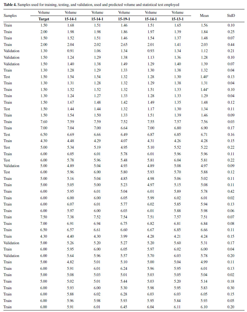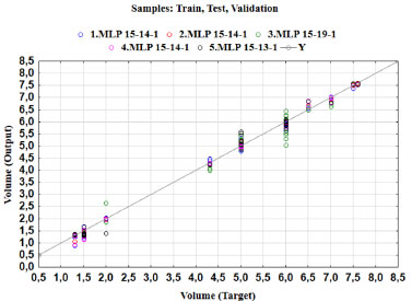 For all cases, both the Newman-Keuls test and the Tukey test applied to the means did not show significant differences, at the 5% level, when analyzing the extracts volume values and the mean value obtained by the 5 networks chosen with the p statistic ranging from 0.12 ≤ p ≤ 0.99. Since Tukey's method is only valid if the variance is homogeneous, Levene's test was applied. In the test, the p-value was greater than 0.05, except for two cases that are indicated by asterisks in the mean values (Table 4), so the hypothesis of variance homogeneity was accepted. The 5 selected networks presented a performance of 0.99 for training, testing, and validation, that is the best performance. The error ranged from 4 x 10-4 to 1 x 10-2 for training, from 5 x 10-2 to 5 x 10-3 for testing and from 1 x 10-2 to 3 x 10-2 for validation. To activate the hidden layer, the exponential and tanh algorithms were applied and for the output, activation was used the identity, logistic, and tanh. The algorithms used for activating the hidden layer and for activating the output were selected by the software among those that compose its library for the module used, that is, identity, logistics (logistic sigmoid), hyperbolic tangent, exponential, and sine. Figure 2 shows the dispersion between the target volume and output, during the training of the 5 best neural networks of the MLP type, which is a quality indication of the regression model.