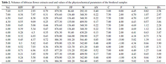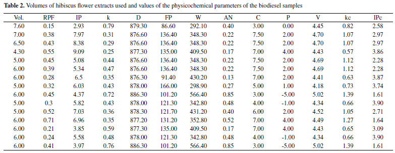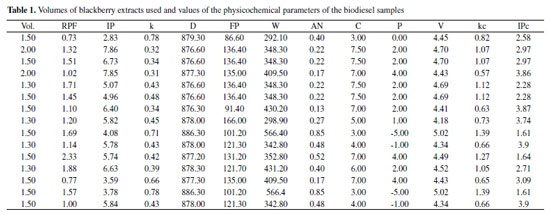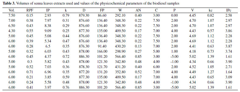 RESULTS AND DISCUSSION The three alcoholic extracts used were subjected to analysis of total phenols content to verify the antioxidant efficiency. The phenols have in their chemical structures one or more hydroxyl groups that are responsible for the biodiesel protections. The content of total phenols expressed as gallic acid equivalent in the blackberry, hibiscus flowers and senna leaves extracts was 16.45 (± 0.27), 4.62 (± 0.14), and 4.06 (± 0.12) mgGAE g-1dry mass, respectively. From the results obtained and to evaluate the oxidative stability at 110 ºC (IP), aliquots of 1.30 - 2.00 mL of blackberry extract were taken to add 4.28 - 6.60 mgEAG in 100g of biodiesel; 4.28 - 7.57 mL of hibiscus flower extract corresponding to 3.96 - 7.00 mgEAG/100g of biodiesel; and 4.28 - 7.57 mL for the senna leaves extract corresponding to 3.48 - 6.15 mgEAG/100g of biodiesel. Before the extracts were added to the biodiesel, the alcohol was evaporated so they do not interfere in the biodiesel physicochemical parameters, especially the flashpoint. Among the parameters used are: the volume in mL; dimensionless relative protection factor (RPF); density (D) in kg m-3; flash point (FP) in °C; kinematic viscosity at 40 °C (V) in mm2 s-1; water content (W) in mg kg-1; acid number (AN) in mg KOH g-1; cloud point (C) in °C; pour point (P) in °C; sample rate constant (k) in h-1; control rate constant (kc) in h-1. The induction period of the samples containing the extracts (IP) and the induction period of the control sample (IPc) in h was determined, tabulated (Table 1, 2, and 3), and processed in the regression module of the automated Neural Network of the software Statistica 13.4 (2018),13 to evaluate the physicochemical parameters' behavior of the biodiesel samples and their impact on the volume of the alcoholic extracts of blackberry, hibiscus flowers, and senna leaves added to the biodiesel samples. In Tables 1, 2, and 3, it is possible to observe that all extracts increase the biodiesel induction period, with the blackberry extract presenting greater influence, as it has 3.56 and 4.05 times more phenolic compounds in its composition than the extracts of hibiscus flowers and senna leaves, respectively. In addition, it has a relative protection factor greater than one in most experiments, and the rate constant of the biodiesel oxidation reaction undergoes a greater reduction when using this extract.