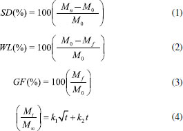 EXPERIMENTAL PART The materials used were sodium carboxymethyl cellulose - NaCMC (Sigma-Aldrich / USA, Mw 250,000 Dalton, substitution degree of 0.80-0.95 and viscosity of 400-800 cP); Citric acid anhydrous - CA/Brazil (São Lázaro®); Melaleuca alternifolia and Melaleuca armillaris essential oils (Bioleucx®) from the city of Piedade-Sao Paulo/Brazil, and sterile saline solution (Sorimax®)/Brazil. Chromatographic analysis The chromatographic analysis of the bioactive oils was performed in a gas chromatography system coupled to mass spectrometry (GC MS, GC-17A / QP2010 Plus, Shimadzu / USA), HP-5MS capillary column, at 60 °C for 1 minute. It was then heated to 290 °C (10 °C min-1) and held at this temperature for 10 minutes. The injector temperature was 220 °C, interface of 310 °C, source of ions at 250 °C and impact energy of 70 eV. The carrier gas was helium with a flow rate of one mL min-1, split ratio 1:30 and 1.0 μL of bioactive oil injected with dichloromethane. The mass spectra were acquired in the scan range of 40-500 µm. Identification of the components of the essential oils was performed by comparison to the library database (Nist08). Samples manufacturing For gel samples, 3g of NaCMC was added to 100 ml of distilled water under mechanical stirring for 90 min at room temperature. Then, for each 25 mL of NaCMC solution under magnetic stirring, 0.08 g of anhydrous citric acid was added for physical crosslinking.29 The prepared solutions were poured in ø90 mm petri dishes. Samples were dried in oven for 24 h at 50 °C. The NaCMC samples were then submitted to permeation by Melaleuca oil, 1 ml of melaleuca oil per sample, for 20 days for complete absorption (samples were named as: NaCMC-MA (NaCMC-Melaleuca armillaris oil) and NaCMC-MTT (NaCMC-Melaleuca alternifolia oil).30 All samples were crosslinked by citric acid. Physico-chemical analysis The physic-chemical evaluation of the samples was performed by Fourier Transform Infrared Spectroscopy - FTIR, using Vertex 70 instrument, Bruker®/USA, wavenumber range of 400 cm-1 - 4000 cm-1. Mechanical tests For the tensile tests, three samples of each composition were cut into rectangular shape (30 mm x 10 mm x 1 mm). The tests were performed using an EMIC DL 10000 testing machine ITW®/USA, load cell of fifty kgf, crosshead rate of 3 mm/min until failure. The elastic modulus of the samples (E) and their failure strength were calculated. Thermal analysis Thermal analysis was performed using a TGA Q50/Q500 instrument (TA Instruments Co./USA). Approximately (3,1 ± 0,9) mg of each gel were evaluated under a continuous N2 gas flow (30 mL min-1), at a heating rate of 10 °C min-1, between 25 °C and 400 °C. In vitro analysis The swelling behavior of the samples (triplicates for each composition) was found by measuring the samples weight. The initial weight of the dried samples (Mn) and their swollen weight (for 1 h, 2 h, 3 h, 4 h, 24 h, 48 h, 72 h, 96 h) in saline solution (9 mg of NaCl in 1 mL of purified water per 1 mL, pH 6.0) at room temperature (Mo). The adsorbed saline solution was removed with filter paper. After 4 days in saline solution, the samples were dried in oven (overnight at 50 °C) and their dry weight was measured (Mf). The swelling degree (SD), weight loss (WL) and gel fraction (GF) were calculated according to equations 1-3.31 The results of swelling degree were evaluated to describe the swelling kinetics of all samples.32 The dominant mechanism of swelling was evaluated by the equation 4, where Mt/M∞ is the amount of saline solution uptake at each time interval (t), k1 and k2 are constants. The diffusion exponent was determined according to the size of the samples, following the steps proposed by Peppas-Sahlin method.32 ![]() The Mueller-Hinton diffusion method was used to evaluate the oils bactericide activity. In this test, the inoculum of the microorganism was obtained an S. aureus culture grown on PCA agar (Plate Count Agar), based on a standard agar for counting bacteria in which S. aureus was cultivated for 18 h. It was then suspended in 3 mL of peptone water to obtain an isotonic medium and adjusted to McFarland scale 5, which was evaluated according to turbidity, resulting in a concentration of ~1.5 x 108 CFU mL-1 of S. aureus in the agar plate. Dilutions were then carried out to obtain suspensions of approximately 106 CFU mL-1.33 A solution of 'Mueller-Hinton agar' was obtained by diluting 5.7 g of agar for each 250 mL of media, being heated, and poured on a sterilized Petri dish, exactly 20 mL in each dish. After the solution got consistency, it was placed in an oven at 30 ± 1 °C for 24 h. To obtain the S. aureus agar plates, 0.1 mL aliquots of the suspension was poured on each Petri dish, spread with the aid of a Drigalsky loop. Using a sterile drill, three wells of 7.5 mm in diameter were drilled, and these were filled with fifty µL of each oil (The oils were exposed to room conditions for 20 days, to meet the time of oils application on gels, and then they were evaluated), where ampicillin was used as the known antibiotic control. The plates were kept steady for 24 h. The diameter of the halos was then measured in millimeters, which is related to the sensitivity of the oils and the speed of its diffusion in the agar. The samples can be considered:34 sensitive, characterized when an infection from a certain strain can be treated using the dose of the antimicrobial agent; intermediate; when it is possible to administer a drug above the normal limit (related to drugs with low pharmacotoxicity); resistant, which implies that resistant strains cannot be inhibited by usual concentrations of antimicrobial agents and it is likely to develop microbial resistance mechanisms. The antimicrobial activity of Na-CMC samples was performed against strains of S. aureus. The test performed was an adaptation of the ASTM 2180-07 (2012) standard, which consists of a quantitative analysis of the effect of antimicro