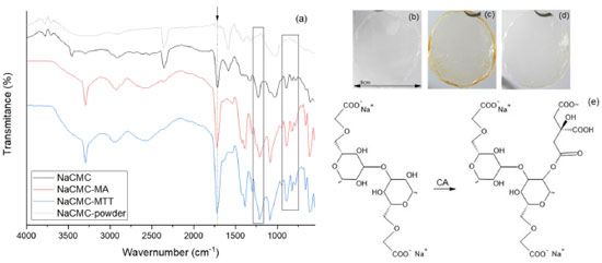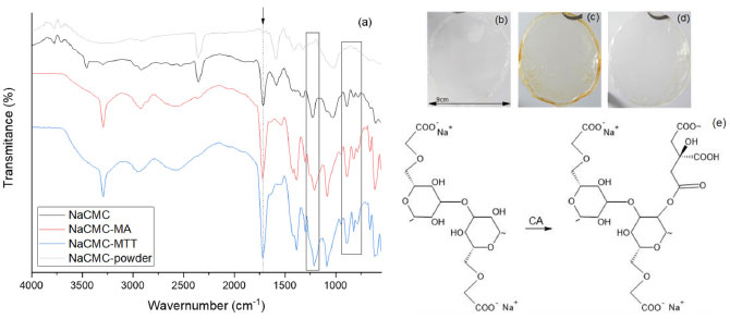 ![]() Figure 1. (a) FTIR analysis of the samples: NaCMC, NaCMC-MA (NaCMC-Melaleuca armillaris), NaCMC-MTT (NaCMC-Melaleuca alternifolia); and NaCMC-powder, the non-crosslinked raw material for all membranes. Images of the membranes (b)NaCMC, (c)NaCMC-MTT and (c)NaCMC-Ma. (e) The scheme of NaCMC crossliking by citric acid (CA)