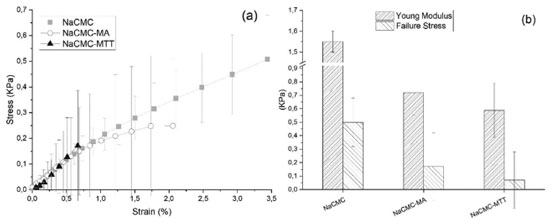 When loaded with the Melaleuca oils, the NaCMC spectrum presents a few changes, as shown by rectangles in Figure 1. The band at 3293 cm-1 (O-H stretching) is more intense, as is the band at 1715 cm-1, which is attributed to contributions from Melaleuca's carbonyl C=O groups,43 presence of α-terpinene44 and ester bond between CA and NaCMC.29,41 There are bands related to Melaleuca oils, such as the bands at 1539 cm-1 (terpinolene); 1422 cm-1 (CH2- and -CH3 scissoring due to terpineol, limonene); 1385 cm-1 (CH2- and -CH3 scissoring of 1,8-cineole, terpinen-4-ol, terpinolene); and 1300 cm-1 (C-C bonds of 1,8-cineole).44,45 In the NaCMC gels containing oils there are more intense bands at 1083 cm-1 (γ-terpinene); 950 cm-1 (γ-terpinene); 889 cm-1 (terpinen-4-ol); 824 cm-1 (γ-terpinene), 785 cm-1 (γ-terpinene), all related to melaleuca oils.44,46 The NaCMC band at 1223 cm-1 is slightly displaced to low wavenumber (1210 cm 1), indicating a probable physical interaction between NaCMC and the melaleuca oils.43 Similar physical interaction was observed by FTIR bands' displacement on samples of soluble dietary fiber/sodium carboxymethyl cellulose/thyme essential oil.47 Mechanical analysis The NaCMC sample presented average failure strength, strain, and young modulus higher than the others (Figure 2). The melaleuca oils have a plasticizer effect, where their location between the NaCMC, interfering with the CA crosslinking effect. In addition, water should be removed from the reacting system to dislocate the equilibrium towards crosslinking.48 Regarding the effect of essential oils, adding frankincense oil to carboxymethyl cellulose-chitosan biguanidine hydrochloride gels increased slightly the samples' mechanical properties (young modulus and failure strength) due to the low plasticizing effect and contribution to the system crosslinking.49 The opposite trend was encountered in the present work, probably indicating plasticizer effect of melaleuca oils in Na-CMC gels. Nonetheless, interaction between NaCMC chains and melaleuca oils cannot be fully discarded. The presence of oil in NaCMC diminished the samples young mudulus, which can be attributted to the presence of oil between NaCMC chains diminishing the chains interactions/entanglements. Gellan gum and coconut oil (VCO) gels prepared by microemulsion presented young modulus and failure strngth dependent on the amount of oil.50 The authors state that "the addition of VCO microemulsion that contains lauric acid (C12 ≈ 78%) and a hydroxyl group is responsible for promoting the formation of hydrogen bonds between gellan gum and VCO microemulsion. This bonding replaces the hydrogen bonds between gellan gum chains and thus decreases the intermolecular bonds along polymer chains."50 Melaleuca alternifolia (MTT) oil, in average, diminished young modulus more than Melaleuca armillaris (MA) oil, although they can be considered statistically similar (p>0.05). The young modulus of the samples containing oil is significantly lower that NaCMC young modulus.