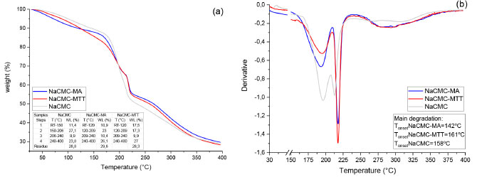 Thermal Analysis The NaCMC gel presented thermal decomposition in four steps, Figure 3. The first one, from room temperature to 150°C (weight loss of 11.5%) is related to the loss of free and bound water.51 The second and main degradation step occurs between 150 °C and 206 °C (weight loss of 38.5%) and would be due to degradation of the NaCMC main backbone chain, cleavage of bonds C-C and C=O, and degradation of the citric acid crosslinks.40,52,53 The third step, from 206 °C to 240 °C (8.9% of weight loss) is probably due to non-reacted citric acid degradation.54 The last step (up to 240 °C) leads to the formation of carbonaceous residue,55 28.8% of weight loss. NaCMC and Melaleuca Armillaris oil were connected by hydrogen bonds, decreasing the polymer chains flexibility. Nonetheless, Melaleuca alternifolia oil probably was located between the NaCMC chains, diminishing the crosslinking points and facilitating the weight loss.40 The third degradation step (at ~217 °C) presented higher weight loss than the NaCMC sample, probably interference of oils with NaCMC crosslinking,40 as indicated by FTIR and swelling analysis. The samples residues were similar, but the oils increase the samples thermal stability. Several steps of degradation are expected in Na-CMC samples, e.g., in soluble dietary fibre/sodium carboxymethyl cellulose/thyme essential oil three degradation steps were observed, the first one related to residual water evaporation, the last two degradation steps related to random thermal degradation of glycoside bonds in polysaccharides, followed by decomposition into fatty acids.47 Essential oils usually degrade (thermal degradation) from 100 °C to 200 °C.56,57 The second event of degradation (derivative curves' inflection) is related to both, NaCMC and the essential oils, but the oils addition led to a slight displacement of the TGA curves toward high temperatures,58 although the Tonset indicates the opposite. The Tonset displacement toward similar or low temperatures might be a contribution of the oils decomposition.56,57 Chitosan membranes loaded with ginger and cinnamon essential oils presented higher thermal estabillity with the increase of the amount of essential oils: "with the lowest amount of ginger oil, the structure of the polymer changed but, when adding more EO, the structure forms a more homogeneous structure, which increases the thermal stability."59 Nonetheless, the increase of essential oil in the membranes diminished the samples failure strength, which would due to "the partial replacement of stronger polymer-polymer interactions by weaker polymer-oil interactions in the network of membranes incorporated with essential oil."59