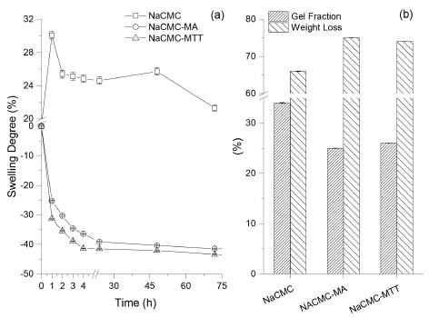 ![]() Figure 4. (a) Swelling analysis of the samples and (b) gel fraction and weight loss of the samples