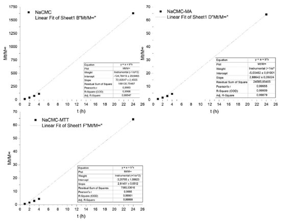 The gels swelling ability diminished with the addition of the melaleuca oils. A similar effect was observed in NaCMC-summer savory essential oil samples, where the hydrophobicity of essential oils increased the samples' surface contact angle (the NaCMC-essential oils surfaces were more hydrophobic).63 The samples swelling degree was evaluated according to the release kinetics mechanism, since small molecules release and swelling ability of gels could obey the same kinetic mechanism.64 The dominant mechanism of swelling was evaluated by the Peppas-Sahlin method.32 The gels presented high contribution of relaxation mechanism and low contribution of Fickian diffusion regarding the swelling capacity, independent of the sample's composition.32 In addition, since the equilibrium of swelling degree occurred until 24 h, when applying the values of k1 and k2 of the samples to these swelling degrees, the R2 of all samples analysis was R2 = 0.99, indicating that relaxation mechanism was dominant,32,65Figure 5.