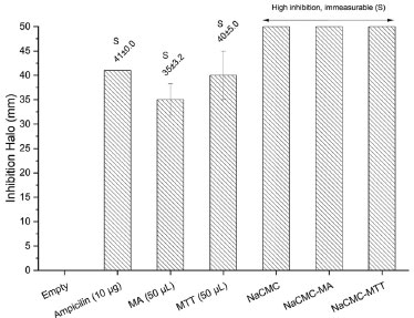 The inhibition of the oils (compared to ampicillin) was evaluated in duplicate using two inoculum of S. aureus66 The oils inhibition values (halos) were classified sensitive (the inhibition halos were superior to 29 mm), Figure 6. The inhibition of ampicillin and of the oils were superior to the one tabulated.66 Melaleuca alternifolia oil showed higher S. aureus inhibition than ampicillin. This oil could disturb the permeability of the bacteria membranes,67,68 probably due to terpenes, e.g. terpinen-4-ol, which usually induce changes in the cellular permeability.38 Melaleuca armillaris oil (MA) presented a satisfactory result compared to ampicillin,66 however it was not as effective as Melaleuca alternifolia oil (MTT).