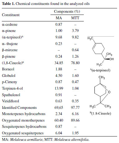 RESULTS AND DISCUSSION GC-MC analysis of essential oils The constituents found in Melaleuca armillaris, and Melaleuca alternifolia oils and their percentage are presented in Table 1. The main components are oxygenated monoterpenes, specially 1,8-cineole, terpinolene and terpinen-4-ol,22,35 where Melaleuca armillaris is rich in 1,8-cineol (34.85%), terpinen-4-ol (13.99%) and α-terpineol (9.68%), which may raise antioxidant properties.36,37 The Melaleuca alternifolia presented 1.04% of terpinen-4-ol and 78.80% of 1,8-cineol. These oils' antimicrobial and antioxidant properties are related to high values of the ratio 1,8-cineol/terpinen-4-ol,38 since these substances affect the bacteria's cytoplasmatic wall stability.35
