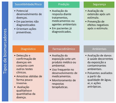 Diversos propósitos podem envolver a avaliação e aplicação de diferentes categorias de biomarcadores. Um recurso importante e em constante desenvolvimento é a identificação de biomarcadores de susceptibilidade ou diagnóstico de patologias, sejam elas bem conhecidas ou não.6 É possível elucidar a relação dose-efeito em um organismo ao se estudar um tratamento farmacológico ótimo para uma doença, avaliando a resposta a partir de biomarcadores farmacodinâmicos específicos, por exemplo.7 Suscetibilidade/risco Biomarcadores do tipo susceptibilidade/risco indicam o potencial de desenvolvimento de uma doença ou condição médica na qual um indivíduo não está clinicamente diagnosticado. Desse modo, sua principal utilidade é orientar ações preventivas, uma vez que neste caso não houve diagnóstico para tal condição médica.8 Assim, esses biomarcadores podem ser usados para determinar qual o estilo de vida, dieta, entre outras intervenções preventivas são mais indicadas a um determinado indivíduo, possibilitando o enriquecimento de ensaios clínicos, da mesma forma que biomarcadores de prognóstico seriam usados. Assim, as estratégias de triagem e/ou orientação podem diferir alguém que parece saudável e alguém que já estabeleceu algum tipo de doença.9 Os casos clínicos mais comuns para a busca desse tipo de biomarcador são as alterações genéticas do DNA, que podem ou não resultar em diferentes tumores malignos. Dentre os biomarcadores recentemente identificados, o fingerprint do proteoma urinário possibilita estimar a susceptibilidade de indivíduos jovens a desenvolverem complicações cardiovasculares. Entre estas proteínas, pode se relacionar a adrenodoxina, a guanina desaminase e o fator de crescimento 15.5,10 Predição Os biomarcadores de predição, diferentemente dos de susceptibilidade/risco, são determinados em indivíduos que já apresentam diagnóstico para uma condição. Estes biomarcadores permitem avaliar a resposta de um indivíduo diante de um tratamento, medicamento ou agente ambiental. Assim, o conceito de biomarcador preditivo pode ser estendido para além dos ensaios de intervenção, tal como os estudos de exposições a toxinas ambientais, fumaça de tabaco, nicotina, álcool, aditivos alimentares, radiação ambiental ou ocupacional, agentes infecciosos, entre outros, ou também, para estudos dos efeitos auxiliares, não intencionais, das diferentes intervenções.6 Dentre os papéis desempenhados pelos biomarcadores preditivos, o crucial é a compreensão de condições médicas que permitam intervenções aplicáveis a um grupo (e não somente a um indivíduo). Um biomarcador preditivo em terapias personalizadas para câncer colorretal metastático é o gene kras. A presença de mutações no gene kras é conhecida como uma resposta negativa do organismo, indicando resistência do tumor durante a terapia realizada.5,11,12 Segurança Durante a exposição de um indivíduo a um tratamento clínico ou a agentes ambientais, ocorre uma resposta a nível bioquímico do organismo que pode alterar a tradução de determinadas proteínas e/ou a presença de metabólitos. Nesse caso, os biomarcadores alterados são classificados como biomarcadores de segurança e, com estes, é possível indicar a presença e extensão de efeitos adversos (geralmente tóxicos) após a exposição a uma terapia ou agente ambiental.5 Os hormônios norepinefrina e cortisol, por exemplo, são biomarcadores de toxicidade característicos relacionados ao aumento da gravidade de miocardites induzidas por estresse.13 A medição desses biomarcadores pode ocorrer tanto antes (a nível de segurança preventiva), quanto depois da exposição, prevendo ou detectando potenciais efeitos tóxicos. Por consequência, a avaliação de biomarcadores de segurança permite a manipulação ou interrupção de dosagens e tratamentos antes que a toxicidade se agrave.5 Diagnóstico Os biomarcadores de diagnóstico, por sua vez, são uma alternativa que auxilia na detecção e confirmação de doenças e condições em diversos estágios, sempre em conjunto a ensaios clínicos e avaliações médicas. Em alguns casos, a busca por esses biomarcadores pode tornar tal diagnóstico menos invasivo, uma vez que podem ser avaliados em matrizes de fácil obtenção como sangue, saliva e urina, evitando a necessidade de uma possível biópsia em pacientes com suspeita de câncer, por exemplo.14 Biomarcadores de diagnóstico permitem a avaliação tanto qualitativa, quanto quantitativa de uma doença e são, cada vez mais, estudados no âmbito da metabolômica, visto que permitem relacionar diversas patologias já confirmadas às condições ambientais, comportamentais e de desenvolvimento (ou seja, o fenótipo) de um indivíduo. Um parâmetro importante é a performance esperada daquele biomarcador diagnóstico para que sejam definidas as condições de uso. Por exemplo, as troponinas cardíacas T e I são biomarcadores bem estabelecidos para o diagnóstico de disfunções cardíacas como infarto do miocárdio, assim como altos níveis de creatinofosfoquinase no sangue.15 Farmacodinâmico/resposta e monitoramento Um grupo importante na avaliação da resposta do organismo a um tratamento clínico compreende os biomarcadores farmacodinâmicos/resposta. Essa classe permite compreender quali- e quantitativamente as alterações bioquímicas, individuais ou de um grupo, que ocorrem durante ou após a exposição a um produto médico ou agente ambiental. Eles não necessariamente refletem o efeito de uma intervenção em um evento clínico futuro, mas são utilizados em contextos específicos como, por exemplo, em efeitos na pressão sanguínea16 e no teste de HbA1c para avaliar o controle de diabetes.17 O uso desses biomarcadores é muito importante ao estabelecer ensaios para o desenvolvimento de medicamentos e para orientar estudos clínicos de dose-resposta.18,19 Os biomarcadores f