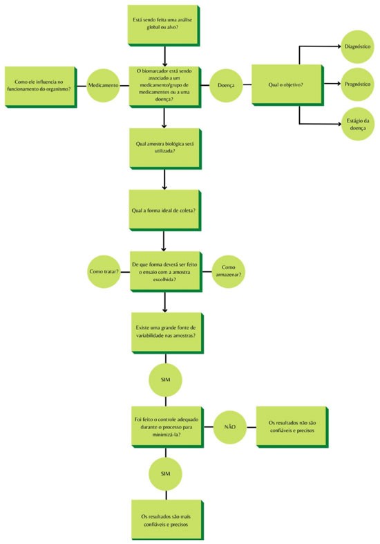 FATORES IMPORTANTES NO DELINEAMENTO EXPERIMENTAL DA PESQUISA DE BIOMARCADORES A investigação de biomarcadores deve sempre iniciar pela elaboração da questão biológica, ou seja, qual o objetivo a ser atingido ao desenvolver aquele estudo. Assim, é importante para que as etapas do processo de análise e o contexto do problema biológico estejam bem definidos. Além disso, o estudo deve ser minucioso ao definir os critérios utilizados ao se encontrar aqueles biomarcadores, já que o metabolismo de cada indivíduo depende de diversos fatores como hábitos alimentares, fatores ambientais, ingestão de medicamentos e origem geográfica, por exemplo, levando à grande variabilidade do metaboloma.6,27 Considerando o potencial de identificar eventos iniciais de uma doença pelo seu histórico natural, assim como sua epidemiologia, médicos e cientistas tornam-se capazes de reduzir as classificações equivocadas de uma enfermidade e as possíveis exposições que levaram um paciente ou um grupo de pacientes a adquiri-la. Dessa forma, surgem diversas possibilidades, a partir das quais potenciais mecanismos relacionados a uma determinada patogênese podem ser explorados, levando em conta possíveis variabilidades e modificações dos efeitos previstos.2 Essa possibilidade foi exemplificada na revisão feita por Shafi et al. reunindo estudos que revelaram possíveis relações da COVID-19 com doenças cardiovasculares.28 Assim, realizando uma análise da concentração de possíveis biomarcadores associados a doenças cardiovasculares, como por exemplo a cTnI (Troponina I), em pacientes com COVID-19, foi possível concluir que o vírus pode potencializar a doença pré-existente ou aumentar a suscetibilidade de desenvolver uma nova complicação/fator de risco para ela. Ainda tomando a Troponina I como um exemplo, ainda há controvérsias quanto a sua característica de biomarcador, pois, apesar de ter revolucionado o diagnóstico do infarto agudo do miocárdio, seu processo de validação foi complexo devido a variação das características operacionais dos ensaios realizados, principalmente o limite inferior de detecção, fator este que pode levar a uma grande diferença no tratamento médico do paciente.6,29 Para definir os parâmetros do estudo consistentemente, algumas perguntas podem ser feitas para entender de forma criteriosa o contexto em que os biomarcadores encontrados estão contidos, como as apresentadas na Figura 2. Outras questões podem também ser feitas, mas o importante é que os pesquisadores desenhem o estudo de forma completa para ter pleno conhecimento do caminho que vão percorrer a fim de minimizar erros e obter uma conclusão lógica ao final do estudo.5,30