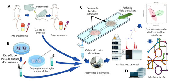 ![]() Figura 3. Modelos de estudo utilizados na pesquisa de biomarcadores. A) Modelos in vivo, nos quais utiliza-se os organismos vivos para avaliar a resposta do organismo quando um estímulo (tratamento) é aplicado; B) Modelos in vitro usualmente desenvolvidos por cultura celular dos quais tem se desenvolvido modelos mais aperfeiçoados como os C) sistemas -on-a-chip, nos quais o meio de cultura que percorre o microssistema, é coletado para analisar as alterações do perfil metabólico após as perturbações aplicadas; e finalmente os D) modelos in silico que visam a modelagem das respostas metabólicas e essencialmente estão baseados em sistemas de bioinformática. Fonte: Autor